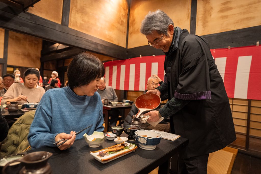 どべっこまつりでは、茅葺屋根の南部曲り家を会場に、どぶろくを片手に郷土料理を楽しみ、語り部による昔話や郷土芸能の神楽鑑賞が楽しめる、冬ならではの特別なお祭りです。