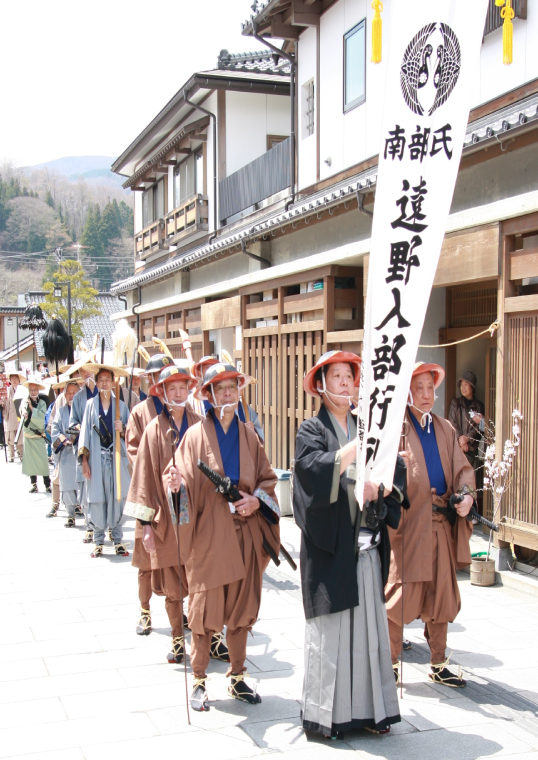 南部氏遠野入部行列は、当時の資料を参考にして、遠野郷に入部した季節に行列を再現した、南部氏の功績を称え、遠野の歴史と往時の入部を忍ぶものです。