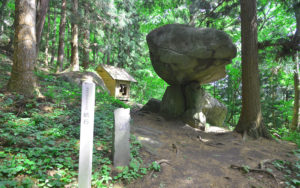 鳥居をくぐり、山の小道を15分ほど登ると、杉林の小高いところに鳥居状の巨石に出会うことができます。
