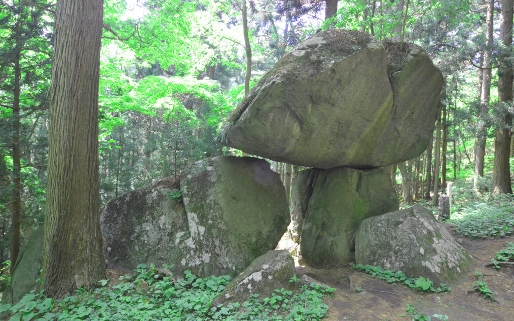 2つ並んだ石の片側のみ、幅7m×奥行き5m×厚さ2mほどの巨石が乗っている不思議な場所で、古代人の墓とも、弁慶が積んだとも言われています。