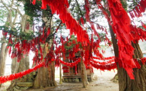 恋愛の神様として知られる小さな祠。卯子酉様とも呼ばれています。境内にある無人販売店で赤い布を買い、左手で木に結ぶことができれば恋が叶うと言われています。